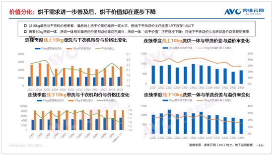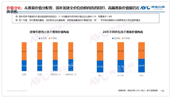 第二,從套裝的價值分配來看,從2022年開始,洗干套裝中洗衣機的價值占比就在不斷提升,奧維云網(AVC)數據顯示,從2022年-2024年M9-12.洗干套裝中洗衣機價值占比由37.3%提升至41.1%。此外,隨著洗干套裝價格由6k-提升至12k+,洗衣機價值占比也有39.5%提升至44.9%,這說明高端套裝的價值錨也正向中高端洗衣機傾斜,烘干對洗干套裝的加持正在逐步減弱。如果說干衣機是洗護產業升級和增量的重要抓手之一,那么現在其助推產業發展的效果正在逐步減弱。