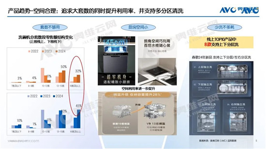 目前,對于中國家庭而言,洗碗機普遍存在的痛點是:套數(shù)不夠用,廚房空間小,沒有分區(qū)洗造成耗能溢出。基于以上痛點,在2024年洗碗機普遍朝著大套數(shù)、適合廚改及設置分區(qū)洗這三個方向做了迭代和調(diào)整,在滿足大套數(shù)的同時提升了空間的利用率,針對L、U形廚房及窄櫥柜也有對應的空間安裝。