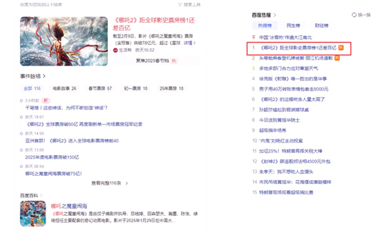 2月10日上午11點左右,“《哪吒2》距全球影史票房榜1還差百億”登上了百度熱搜榜一。據網絡平臺數據顯示,截至2月9日18時39分,影片《哪吒之魔童鬧海》(簡稱《哪吒2》)票房(含預售)突破80億,成為全球影史第39部票房超過80億(人民幣)的影片。