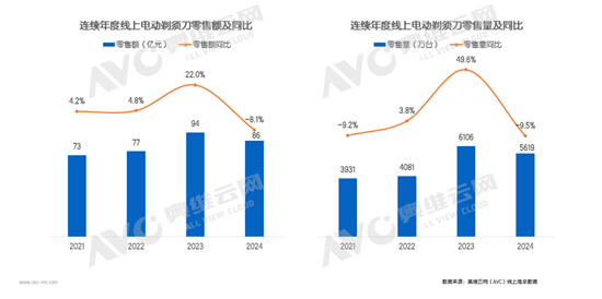在消費升級與健康護理意識不斷覺醒的時代浪潮下,電動剃須刀市場迎來更多關注,奧維云網(AVC)線上推總數據顯示,2020-2023年國內電動剃須刀規模持續增長。然而,進入2024年,市場形勢出現了變化。2024年全年線上電動剃須刀零售額為86億元,同比降低8.1%,零售量5619萬臺,同比下滑9.5%。電動剃須刀在經歷了前期的快速增長后,市場逐漸趨于飽和,線上面臨競爭加劇、流量紅利逐漸消退等問題。但在需求疲弱的電動剃須刀市場中,仍有積極促進因素在推動行業發展。