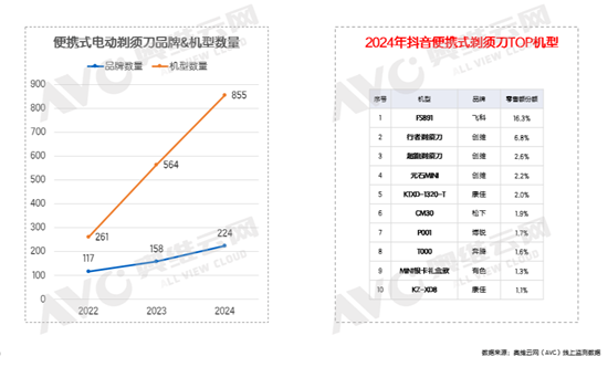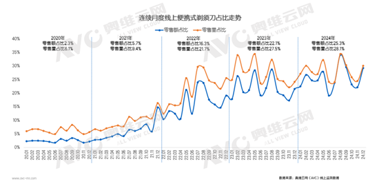 “悅己經濟”驅動中國出游人數明顯增多,根據國內旅游抽樣調查統計結果,2024年國內出游人次56.15億,比上年同期增加7.24億,同比增長14.8%,國內游客出游總花費5.75萬億元,比上年增加0.84萬億元,同比增長17.1%。在這樣的背景下,便攜式電動剃須刀因其體積小巧、便于攜帶的顯著特點,逐漸成為市場的新寵。奧維云網(AVC)線上監測數據顯示,便攜式電動剃須刀連續四年增長,2024年線上零售額占比已達到25.3%,在top20機型中占據6款。雖然在傳統電商渠道漲幅趨緩,但在抖音等新興渠道仍有很大的增長空間。
