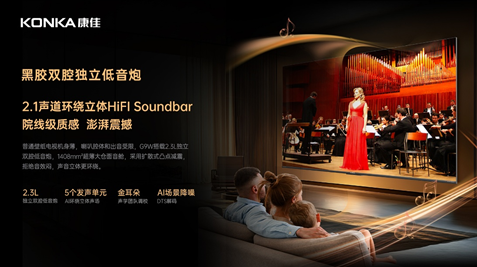 康佳G9W音質表現也格外出色,其搭載2.3L的黑膠雙腔獨立低音炮,可有效提升低頻表現,使得爆炸場面的震撼低音、音樂中的深沉鼓點等都能得以完美展現,讓康佳G9W呈現出最醇厚的低音。