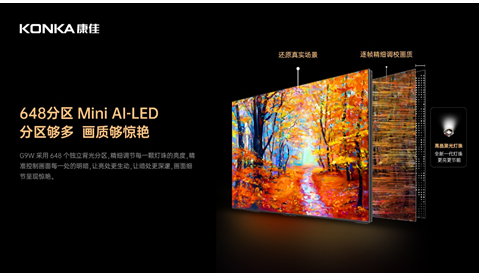 在畫質表現上,康佳G9W搭載的Mini AI-LED顯示技術將視覺體驗提升到了一個全新的高度,實現了更精細的分區控光,從而提供了更高的對比度、更廣的色域和更低的功耗。85吋G9W將屏幕分為648個獨立背光分區,搭配康佳自研AI控光芯片,實現了一個控光芯片控制一顆燈,逐幀精準控制畫面每一處的明暗,讓亮部更加耀眼奪目,暗部更加深邃細膩,畫面整體呈現出令人驚嘆的立體感和真實感。