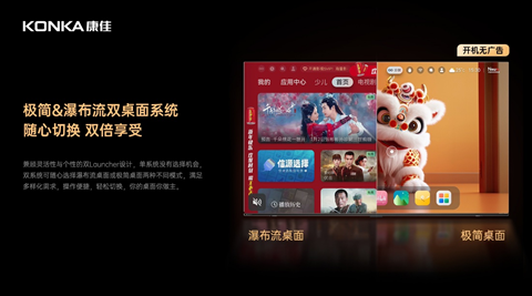 康佳G9W通過雙桌面系統、易AI分屏功能,為用戶帶來了更加靈活多樣的使用體驗,讓一臺電視的價值翻倍,提供以相同的花費享受雙倍的快樂,真正實現“一屏多用,快樂共享”。雙桌面系統方面,G9W突破單一系統的限制,實現了兼顧靈活性與個性的雙Launcher設計,配備極簡和瀑布流兩種桌面模式,用戶可以根據個人喜好自由切換,操作簡便,一鍵切換,真正實現“你的桌面,由你做主”。