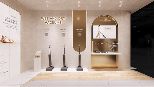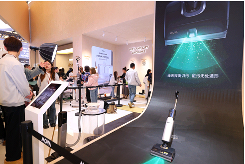 MOVA展區洗地機區域還設置了一個L型的瀑布屏,可以通過pad的操控來進行產品功能的演示,把技術創新更顯性化的表現了出來,現場受到了許多觀眾的關注。同時MOVA還官宣了與時尚芭莎的合作,讓洗地機化身為空間裝置,與日常生活中的時尚配飾”組裝“在一起,更有一種先鋒者的姿態,探展過程中更像是躍入了一場生活的秀場。
