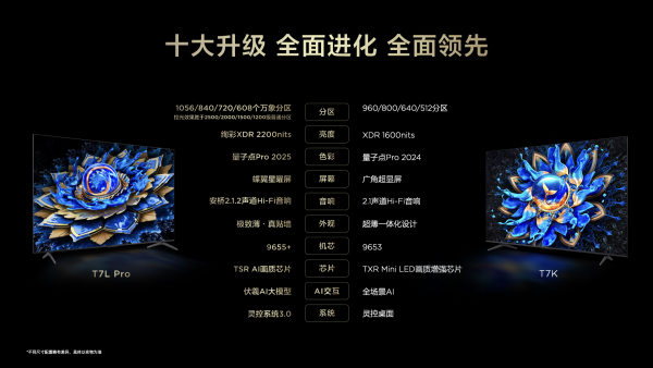 此次TCL推出T7L系列和Q9L系列QD-MiniLED電視,是從面板、控光技術、色彩技術到音響和外觀設計的全方位進化,蝶翼星曜屏、萬象分區控光、TSRAI畫質芯片等萬元旗艦機型的專屬技術開始流向主流產品區間,大幅提升了產品的質價比。
