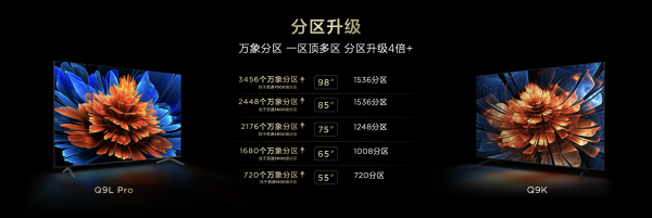 Q9LPro全系共5個尺寸,分別為98/85/75/65/55吋,其中98吋新品零售價16999元,國補后只需14999元;85吋新品零售價9999元,國補后只需7999元;75吋新品零售價7499元,國補后只需5999元;65吋新品零售價5999元,國補后只需4799元;55吋新品零售價4299元,國補后只需3439元。Q9L全系3個尺寸,分別為85/75/65英寸,其中85吋新品零售價8999元,國補后只需7199元:75吋新品零售價6799元,國補后只需5439元:65吋新品零售價5499元,國補后只需4399元。