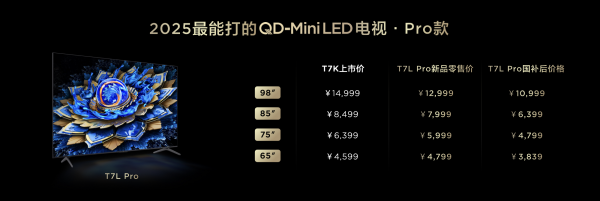 此次發布的四款新品中,TCLT7L系列預售價國補后2799元起,85吋新品零售價6999元,國補后只需5599元;75吋新品零售價5299元,國補后只需4239元;65吋新品零售價4299元,國補后只需3439元;55吋新品零售價3499元,國補后只需2799元,成為2500-5500元檔“質價比之王”。TCLT7LPro系列預售價國補后3839元起,98吋新品零售價12999元,國補后只需10999元;85吋新品零售價7999元,國補后只需6399元;75吋新品零售價5999元,國補后只需4799元;65吋新品零售價4799元,國補后只需3839元。