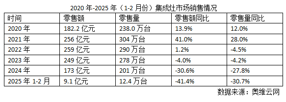 奧維云網(AVC)推總數據:2025年1-2月集成灶銷額9.1億元,同比-41.4%:銷量12.4萬臺,同比-30.7%。從數據上來看,集成灶在2024年基礎之上有跌幅放大的趨勢。