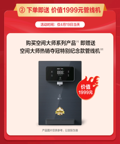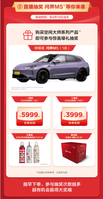 僅此419當天,消費者購買安吉爾空間大師系列全屋凈水,即可獲贈價值1999元的空間大師熱銷奪冠特別款管線機。此外,安吉爾特別設(shè)置抽獎活動,購買安吉爾空間大師系列全屋凈水的消費者將進入抽獎池參與抽獎活動,獎項包括安吉爾藝術(shù)聯(lián)名掛件杯、5999元/3999元大額免單權(quán)益等,特等獎更可獲贈49999元問界M5汽車首付款。