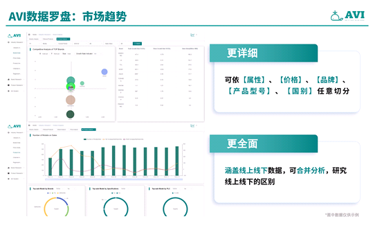 此外,智能分析功能使AVI數據羅盤能夠自動識別市場中的關鍵趨勢和潛在機會,通過內置的大模型算法,該平臺能夠對海量歷史數據進行深度學習,從而預測未來市場動向,為企業提供前瞻性的市場洞察。