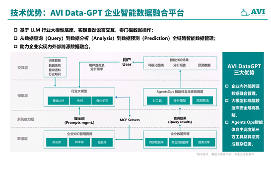AVI Data的技術優勢主要體現在其先進的AVI Data-GPT企業智能數據融合平臺上。該平臺基于LLM(Large Language Model)行業大模型底座,實現了自然語言交互和零門檻的數據操作,極大簡化了數據分析流程。通過從數據查詢(Query)到數據分析(Analysis),再到數據預測(Prediction)的全鏈路智能數據管理,AVI Data-GPT助力企業實現內外部跨源數據融合,提升了數據處理效率和決策精度。