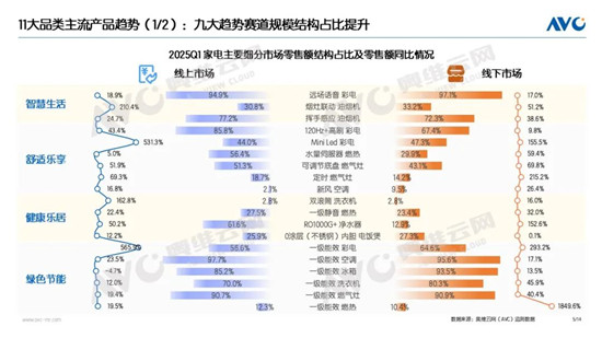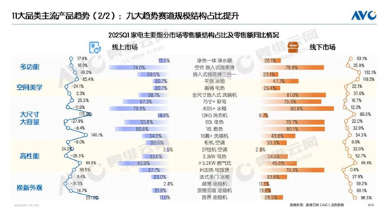 奧維云網(AVC)監測數據顯示,2025年第一季度11大統補品類中的細分市場持續保持高滲透態勢,其對應的消費者功能需求可歸納為九大趨勢賽道:智慧生活、舒適樂享、健康樂居、綠色節能、多功能、空間美學、大尺寸/大容量、高性能、換新外觀。值得關注的是,在政策引導和市場教育雙重推動下,綠色智能家電產品受到消費者廣泛青睞,節能產品正加速替代高能耗產品,同時家電消費需求已實現從"有沒有"到"好不好"的質變升級,在智慧生活、綠色節能、大尺寸/大容量趨勢表現尤為明顯。以線上市場為例,部分品類消費升級特征顯著: