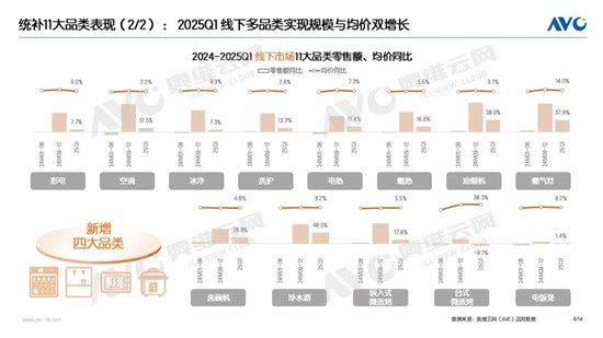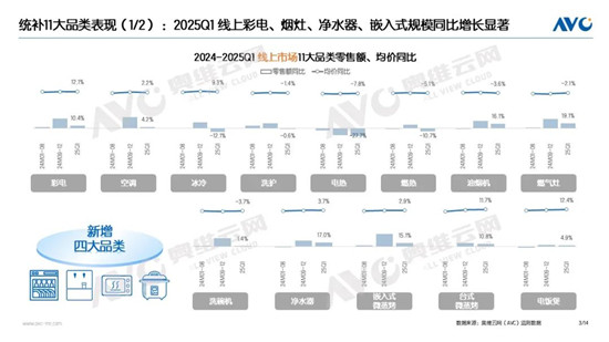 奧維云網(AVC)監測數據顯示,2025年第一季度線上市場彩電、空調、油煙機、燃氣灶、洗碗機、凈水器、嵌入式微蒸烤、臺式微蒸烤、電飯煲零售額分別同比+10.4%、+4.2%、+16.1%、+19.1%、+1.4%、+17.0%、+15.1%、+10.8%、+4.9%。線下市場多品類實現零售額同比正增長,其中油煙機、燃氣灶、凈水器規模同比增長顯著,分別同比+38.6%、+37.9%、+48.5%;從均價同比來看,統補11大品類均呈現均價同比增長,體現了產品結構優化的趨勢。