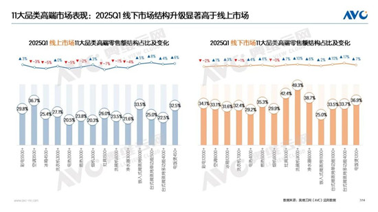 奧維云網(AVC)監測數據顯示,2025年第一季度彩電、洗衣機、煙機、嵌入式微蒸烤、臺式微蒸烤單功能、臺式微蒸烤多功能、電飯煲線上市場高端價位段的產品結構均有明顯的提升;線下市場除彩電、洗衣機、煙機的高端價位段的產品結構出現小幅下滑外,其余品類的高端產品結構仍保持穩步增長,其中洗碗機和臺式微蒸烤規模同比增長超10%。