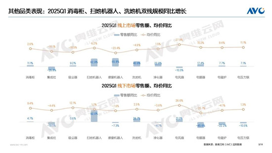 奧維云網(AVC)監測數據顯示,2025年第一季度線上市場消毒柜規模同比+11.1%,清潔電器(吸塵器+9.2%、掃地機器人+62.9%、擦窗機器人+65.8%、洗地機+40.9%),環境電器(凈化器+22.8%、電暖器+17.4%),廚房小電(電磁爐+7.7%、電壓力鍋+7.1%)。線下市場消毒柜、吸塵器、掃地機器人、洗地機、電風扇規模分別同比+4.7%、+0.6%、+92.0%、+26.7%、21.0%。