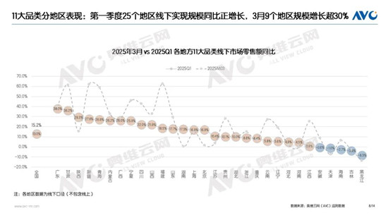奧維云網(AVC)監測數據顯示,2025年第一季度全國線下市場11大品類累計規模同比+13.0%,25個地區實現了規模同比正增長,廣東和甘肅規模同比增長顯著,分別同比+38.0%和36.2%。按月度來看,2025年3月全國線下市場11大品類累計規模同比+15.2%。其中,26個地區實現不同程度的增長,福建、新疆、甘肅、青海、寧夏、四川、廣東、山西、內蒙古等9地區規模同比增長超30%。