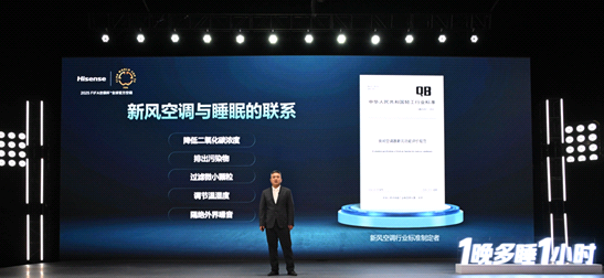 在發布會上,吳海濤指出,海信新風空調憑借其高效清除甲醛、TVOC等污染物,降低二氧化碳濃度以及智能維持濕度區間的能力,為改善睡眠質量帶來了新契機。它無需開窗即可持續增氧換氣,從根本上解決了憋悶和干燥問題,為用戶打造健康舒適的睡眠空間。