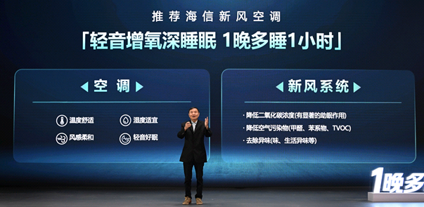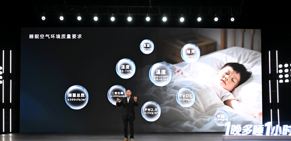 吳教授進一步闡述了環境優化的兩個關鍵方面:首先,適宜的溫濕度控制對睡眠和健康至關重要。海信新風空調通過溫濕度精準控制、柔風防直吹以及16分貝呼吸般靜音等創新技術,為用戶營造出更舒適的睡眠環境;其次,控制室內污染物也是改善睡眠的關鍵。二氧化碳濃度是室內空氣質量的最重要指標,其升高往往伴隨顆粒物、細菌、裝修污染物及異味等有害物質的增加,海信新風空調可以有效降低二氧化碳濃度,提供增氧好空氣,從而改善睡眠環境,起到顯著的助眠效果。