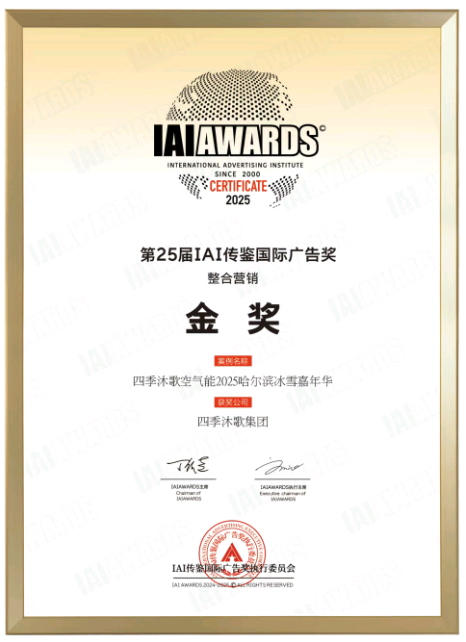 5月21日-22日,第25屆IAI傳鑒國際創意節頒獎典禮在北京隆重舉行。四季沐歌空氣能憑借《2025哈爾濱冰雪嘉年華整合營銷案例》斬獲“整合營銷金獎”,成為本屆賽事中清潔能源領域的標桿獲獎案例。這一榮譽不僅是對四季沐歌品牌創新力的高度認可,也是對其25周年生日到來的熱烈慶賀,更是向其深耕清潔能源領域、積極推動綠色低碳發展的致敬與獻禮。