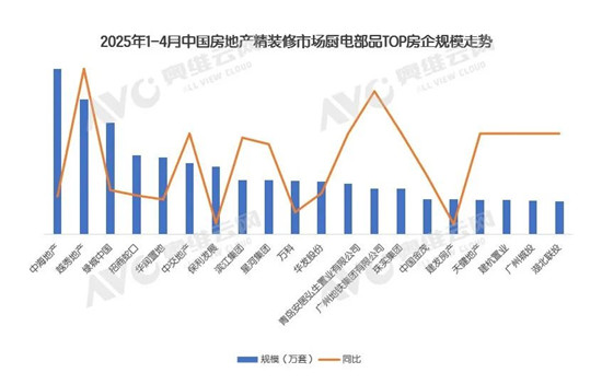 TOP3房企僅中海堅守,越秀地產增速顯著從開發商陣營分析,2025年1-4月精裝廚電六件套中,TOP3房企分別為中海地產、越秀地產、綠城中國,配套規模分別為2.34、1.91、1.58萬套。與去年同期相比,TOP3房企僅中海地產堅守,越秀地產、中交地產、濱江集團、星河集團成功擠進TOP10房企,配套廚電六件套規模分別為1.91、1.01、0.77、0.77萬套;從增速來看的話,越秀地產、中交地產、濱江集團、星河集團等增速明顯,分別上升228.1、100、91.8、78.9個百分比。