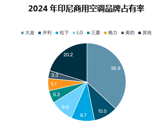 作為東盟規模最大的商用空調市場,印尼 2025 年一季度市場規模達 2.18億美元,同比增長 7.2%,延續了 2024 年 9.8 億美元的全年規模。大金以 36.9% 的市占率領先,開利(10%)、LG(9.7%)、格力(5.2%)、美的(3.3%)構成多元競爭格局。