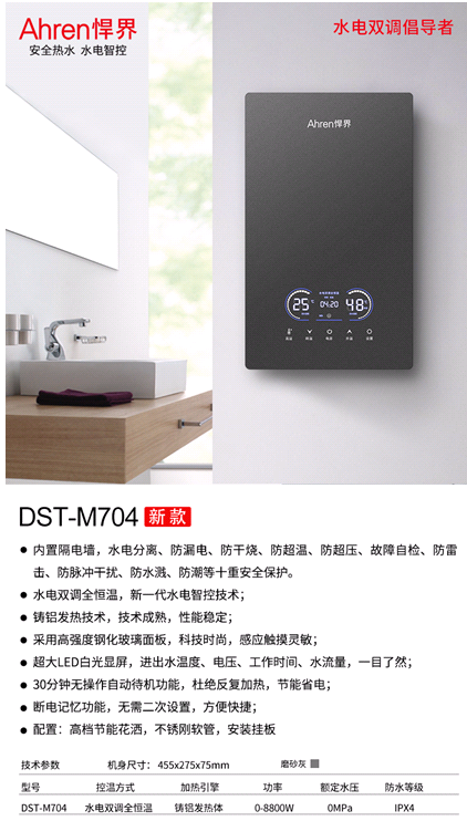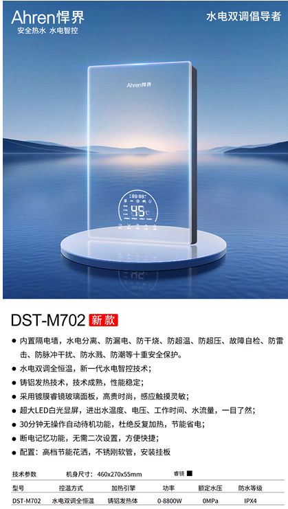 Ahren悍界DST-M702采用的高端的“鑄鋁發熱技術+水電雙調全恒溫+大屏幕顯示+內置隔電墻”的產品平臺,內置隔電墻,應用了防漏電、防干燒、防超壓、故障自檢、防雷擊、防脈沖干擾、防水濺、防潮等多種安全保護,確保產品的安全。大屏幕顯示,電壓、進水溫度,出水溫度、水流量一目了然。M702面板采用了高端的睿鏡鍍膜玻璃面板,具備鏡子一樣的效果。