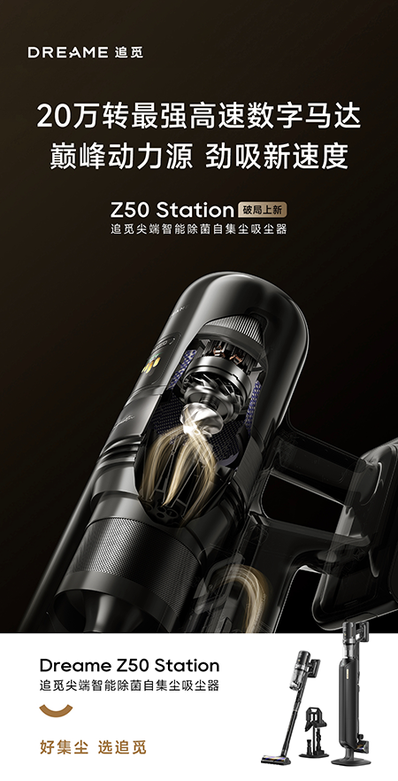 技術突破疊加產業鏈完善,為追覓吸塵器按下了創新與應用的加速鍵。多年來,追覓吸塵器持續憑借量產16萬轉、生產18萬轉、量產落地20萬轉的三重優勢領跑行業。2025年,追覓吸塵器推出Z50 Station,實現20萬轉/分鐘馬達的全球首次量產落地。這種指數級技術突破,從根本上提升了吸塵器的吸力和集塵效率,構筑起追覓吸塵器的“高速護城河”。