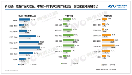 在國家補貼政策的有力推動下,凈水器在2025年618開門紅階段便呈現出量額雙增的良好態勢。從價格段分析,1500元價位段產品市場份額快速擴張,基礎款凈水器市場競爭愈發激烈,行業加速邁入“1元1G”時代(即每獲得1G制水量的成本約為1元)。主銷中端市場產品升級步伐加快,6-8年長效濾芯逐步成為標配,富含礦物質、純/凈分離龍頭等聚焦健康屬性的功能產品市場份額持續提升。高端市場中,頭部品牌不斷強化產品功能配置,行業“頂配”機型市場份額穩步上揚。