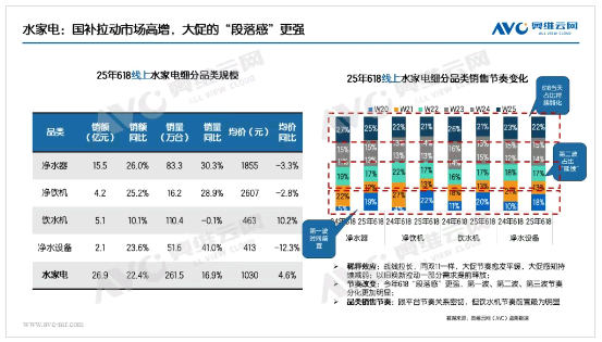 水家電整體:在凈水器、凈飲機等均價較高品類的強勁帶動下,2025年618期間水家電行業迎來全面增長,銷量、銷售額與產品均價均實現顯著提升。從細分品類來看,凈水器低端產品憑借不斷增強的產品競爭力,有效激發了市場需求;凈飲機與飲水機的增長則主要得益于消費者對制冰功能的旺盛需求。在大促節奏方面,今年618大促的活動周期進一步拉長,自5月中上旬便已啟動,分階段的促銷模式使活動節奏更趨平緩,三波促銷之間設置的緩沖期,為消費者提供了更充裕的決策時間。