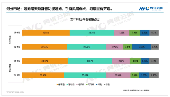 細分市場中,產品創新與功能升級成為拉動銷售的關鍵因素。其中,手持風扇憑借便攜性優勢異軍突起,成為市場新寵;300-400元價位段的高端循環扇銷量持續攀升,展現出強大的市場潛力;落地扇則聚焦消費者對睡眠質量的需求,通過搭載安睡靜音功能贏得青睞;塔扇憑借節省空間、送風柔和等特點,實現銷量與價格的雙增長,市場表現亮眼。