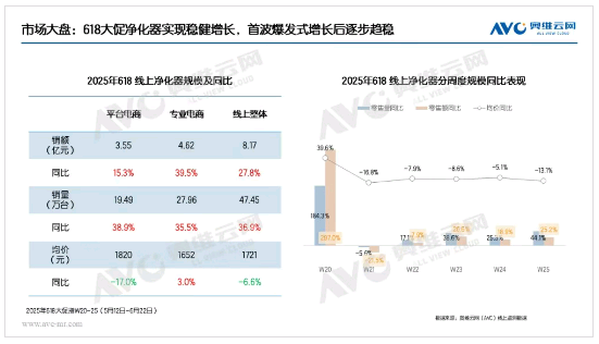 奧維云網(AVC)監測數據顯示,線上市場618大促期間凈化器零售額8.17億元,同比增長27.8%,零售量47.45萬臺,同比增長36.9%,增速均顯著高于一季度26.5%和21.2%的水平。值得注意的是,在銷售規?焖贁U張的同時,行業均價同比下滑6.6%,這主要歸因于高性價比機型主導市場。從促銷節奏來看,由于2024年第20周尚未啟動大促活動,今年首周呈現爆發式增長特征,而隨著促銷活動持續開展,第21-25周增速逐步回歸常態,整體呈現前高后低的走勢。