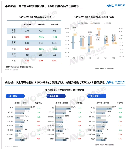2025年618大促期間,加濕器線上市場呈現"量減額降但結構升級"的特征。奧維云網(AVC)監測數據顯示,線上加濕器零售額0.77億元,同比下滑11.9%,零售量37.05萬臺,同比下滑22.0%,市場規模整體收縮。然而,值得注意的是,行業均價逆勢增長13.0%,這一結構性變化主要源于中高端產品的市場份額快速提升,其中400-799元中端價格段零售額份額同比增長6.6%,3000元以上高端市場增長4.2%。這種"量降價升"的市場表現,反映出消費者對產品性能與健康功能的重視程度持續提升,加濕器行業正經歷從普及型消費向品質型消費的過渡階段。