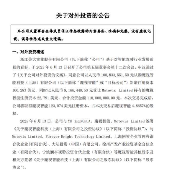 同樣在6月,浙江美大發(fā)布公告,合計投資1.1億元人民幣取得智能駕駛公司魔視智能科技(上海)有限公司4.8657%的股權。智能駕駛與廚電領域雖看似界限分明,但從科技融合的長遠視角審視,科技的發(fā)展往往是相互促進的。浙江美大或許能夠為企業(yè)的未來發(fā)展激發(fā)更多創(chuàng)新遐想。