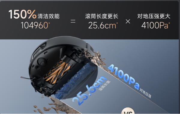 然后在日常拖地時,為了讓拖地效率更高,Z60 Pro的滾筒會向下施加一個4100Pa的對地壓強,這個大壓力等于是在模仿我們?nèi)耸植恋貢r,使用更大力氣去擦拭,這樣才能清除那些頑固污漬!