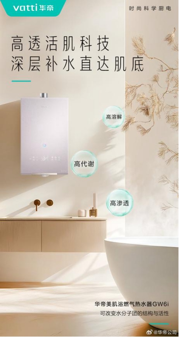 據介紹,華帝美肌浴熱水器是業內首個提出“以水養膚”的創新產品,這一概念的提出填補了行業相關領域的空白。它搭載了高透活肌科技和健康沐浴用水系統。前者通過洛倫茲力的作用,將普通水分子團簇結構縮小至直徑為1—2納米的小分子團簇水,實現對皮膚的深度清潔、深層補水,持續使用能有效美肌。