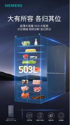 除了空間契合度的全新升級,西門子無界Plus智能平嵌十字門冰箱同樣注重儲鮮空間的實用性。產(chǎn)品以十字門為架構(gòu),提供總?cè)萘?03L的分類存儲空間,滿足多成員家庭日常食材采購與多品類存放需求。其中,冷藏區(qū)達(dá)294L,冷凍區(qū)為181L,并配有獨(dú)立28L變溫區(qū),兼顧容量與功能的靈活性。