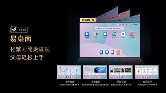我們的父母日常不會使用智能電視,原因多在于電視的操作設計過于復雜,康佳G10易AI系統意在讓操作方式更簡單。它搭載了基于康佳自研百曉大模型的易AI系統,擁有簡潔好用的易桌面,選擇信號、影音投屏、觀影記錄和應用推薦四大常用功能懸浮于底欄,父母想重溫前一天沒看完的劇集、切換信號源、電視大屏影音快速投屏等需求都能實現兩步內完成,省去了多級菜單尋找或選擇的煩惱,用起來像手機一樣順手。