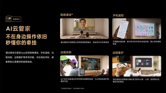 總體來看,康佳G10的遠程看護和視頻通話功能優勢在于,它不只是解決“能不能聯系”的問題,更化解了“想陪伴卻無法回家”的無奈,讓子女的牽掛有處安放,讓父母的思念能被真切看到。而通過構建“需求預判-技術轉化-場景落地”的高效研發鏈路,康佳也成功實現了技術創新與人文關懷深度融合。G10新品這些創新功能的實現,有力證明了康佳在智能電視領域多年來的深耕與成果。
