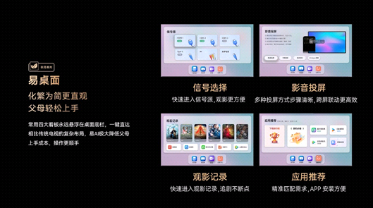 那如何讓父母覺得電視操作更容易些呢?康佳近日推出了一款專為父母打造的易AI電視D7J系列新品,它搭載了基于康佳自研百曉大模型的易AI系統,擁有全新自研易桌面,將“選擇信號、影音投屏、觀影記錄和應用推薦”四大常用功能懸浮在桌面底欄,當父親想要觀看昨天沒看完的《掃毒風暴》電視劇時,無需再像以往那般在復雜的菜單中翻找,僅需點擊底欄的“觀影記錄”,就能快速找到并繼續觀看;母親若想將手機里孫子的照片投屏到電視上給全家展示,點擊“影音投屏”,依照簡單提示操作,就能輕松實現。易桌面布局極大簡化了操作流程,讓父母們在使用智能電視時也能游刃有余。