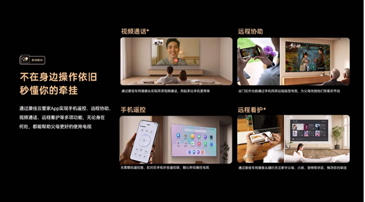 康佳易AI電視D7J系列云 - 端互聯的云管家讓異地互動像“坐在同一間客廳”般自然,讓遠程互動突破屏幕的局限。當父母對著電視里的復雜設置犯愁時,子女在千里之外打開手機云管家小程序,就能遠程操控父母的電視界面,幫他們切換到想看的頻道、調整音量亮度,甚至清理后臺緩存。普通手機視頻的小屏幕總讓父母看不清子女的臉,而通過云管家發起的電視視頻通話,能讓畫面鋪滿整個大屏。過年時,子女可以舉著手機帶父母“云逛”自己的新家,父母坐在熟悉的沙發上,看著大屏里子女的笑臉,聽著他們身邊的環境音,仿佛子女就坐在對面的沙發上嘮嗑。此外通過康佳專用攝像頭可隨時關注家里父母、小孩、寵物等狀態,讓我們的牽掛有了落地的方式。