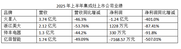這是什么概念呢?就是說2025年上半年集成灶頭部四家上市公司合計銷售額不及2021年上半年火星人(9.22億元)或者美大(9.09億元)一家銷售額。