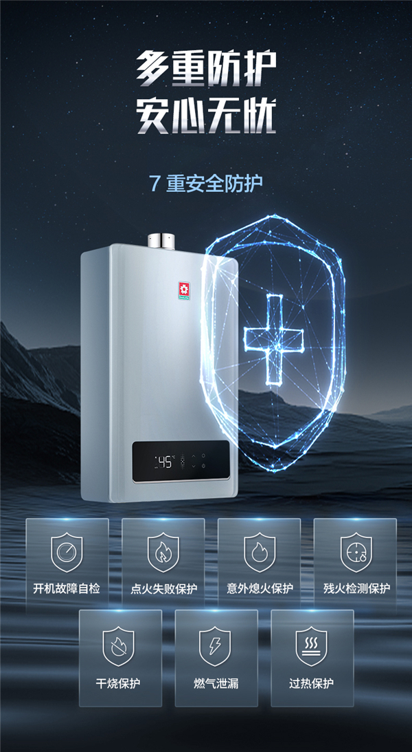 家庭用水場景越頻繁,安全保障越關鍵。櫻花燃氣熱水器的七重防護體系,在多場景使用中時刻在線:開機自檢確保每次啟動,無論清晨洗漱還是深夜廚房用水,都處于安全狀態;點火失敗保護避免廚房頻繁開關水導致的點火異常;干燒保護防止忘記關水龍頭后的隱患;漏電保護則在洗漱、廚房等潮濕環境中額外添一份安心。