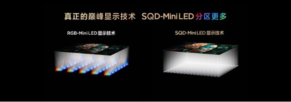 RGB-Mini LED電視的發光芯片由三色發光芯片組成,即三顆燈為一組才能發白光,而SQD-Mini LED一顆發光芯片就能發白光,一燈頂RGB-Mini LED三燈。同樣成本,同樣燈數,SQD-Mini LED比RGB-Mini LED分區更多。