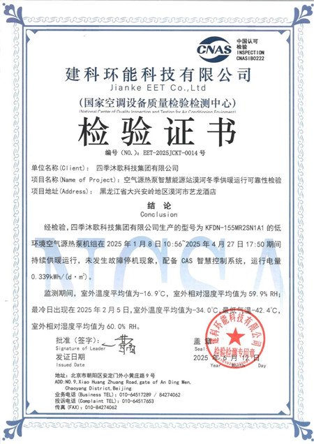 在供暖效果上,四季沐歌供暖系統(tǒng)為酒店建筑營(yíng)造恒溫20℃以上的舒適入住環(huán)境,1月份供暖室內(nèi)外溫差高達(dá)50℃以上。在節(jié)能與投資上,對(duì)比80元/㎡的傳統(tǒng)市政供暖單價(jià),四季沐歌應(yīng)用熱泵技術(shù)、CAS智控技術(shù),每年可為酒店節(jié)約55%供暖成本,另外空氣源熱泵分布式智慧能源站、熱泵耦合電鍋爐的方式,比接入市政供暖要節(jié)省45%的初投資成本。憑借在極寒環(huán)境中的出色發(fā)揮,“四季沐歌空氣源熱泵智慧能源站漠河冬季供暖運(yùn)行可靠性檢驗(yàn)”項(xiàng)目榮獲環(huán)能?chē)?guó)檢檢驗(yàn)證書(shū),也是環(huán)能?chē)?guó)檢漠河極寒實(shí)證基地建立以來(lái)的首個(gè)可靠認(rèn)證,不僅以權(quán)威數(shù)據(jù)印證了四季沐歌空氣能在極寒環(huán)境下的可靠性能,更打破了行業(yè)對(duì)“極寒地區(qū)空氣能不能用”的固有認(rèn)知,為全球極寒地區(qū)清潔能源供暖提供了可參照、可復(fù)制的行業(yè)范本。
