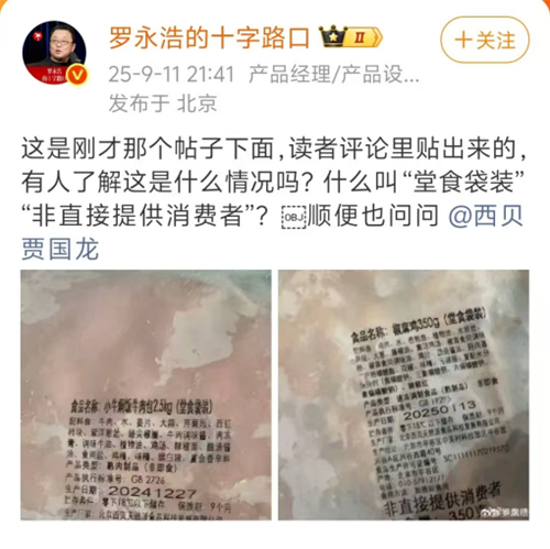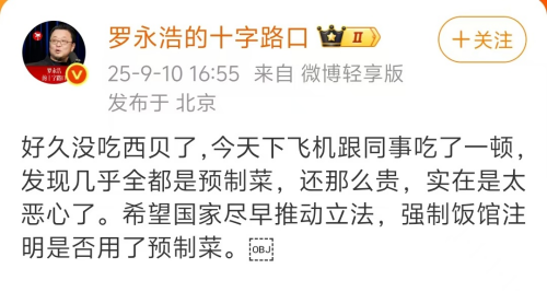 9月11日,羅永浩在新浪平臺發(fā)布微博稱:“好久沒吃西貝了,今天下飛機(jī)跟同事吃了一頓,發(fā)現(xiàn)幾乎全都是預(yù)制菜,還那么貴,實在是太惡心了。希望國家盡早推動立法,強(qiáng)制飯館注明是否用了預(yù)制菜。”