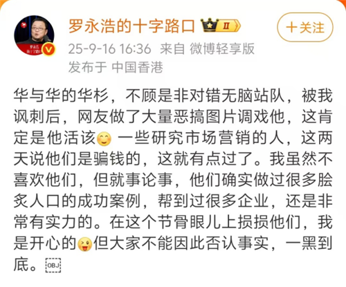 此后雙方就西貝是否是預(yù)制菜、西貝曬“羅永浩(同款)菜單”是否合法等方面進(jìn)行唇槍舌戰(zhàn)。期間,羅永浩對吉祥餛飩、朱光玉火鍋、霸蠻牛肉粉等聲援西貝的餐飲品牌,進(jìn)行了點名。14日晚,有截圖流出稱賈國龍稱呼羅永浩為“網(wǎng)絡(luò)黑社會”,再次點燃雙方的戰(zhàn)火。