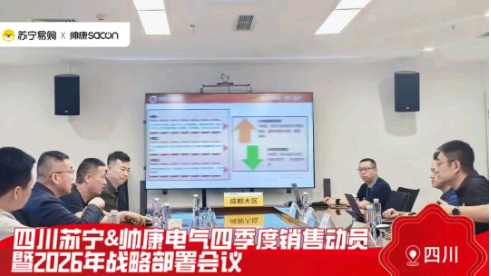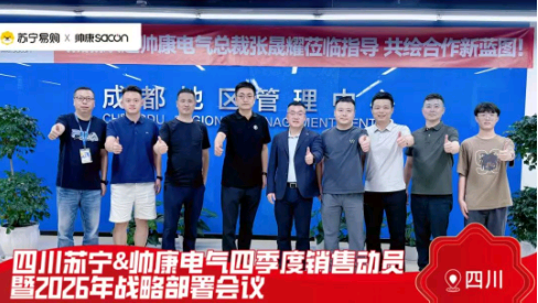 近日,帥康電氣總裁張晟耀率核心團隊親赴成都,與蘇寧易購成都地區管理中心總經理朱強發等高層領導共同出席“四川蘇寧&帥康電氣四季度動員暨2026年戰略部署會議”。雙方圍繞市場布局、產品策略與渠道建設等展開全面溝通,為未來的協同發展奠定堅實基礎。