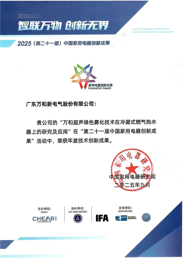 其中,廣東萬和新電氣股份有限公司的“超聲綠色霧化技術在冷凝式燃氣熱水器上的研究及應用”,憑借對行業痛點的顛覆性解決能力與標桿性價值,成功斬獲“年度技術創新”榮譽稱號。這一榮譽的背后,不僅是一項技術成果的高光亮相,更是中國家電企業從產品輸出向技術標準輸出的里程碑事件。