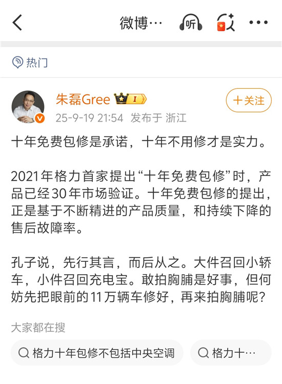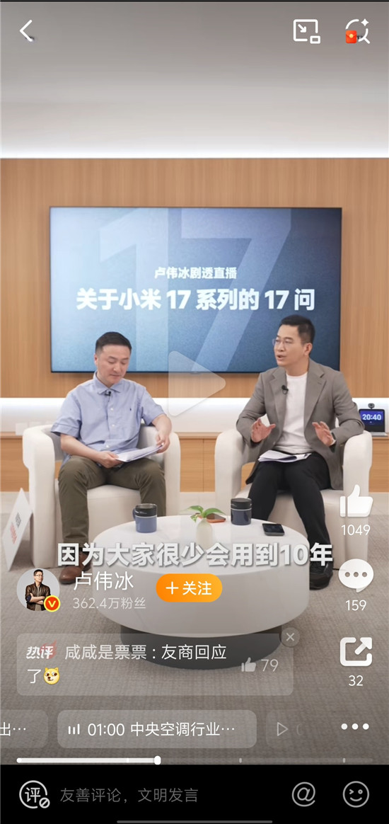 可能正是基于8月份的這場口舌之爭,在9月19日,盧偉冰在直播中宣布:小米空調正式推出十年免費包修服務。
